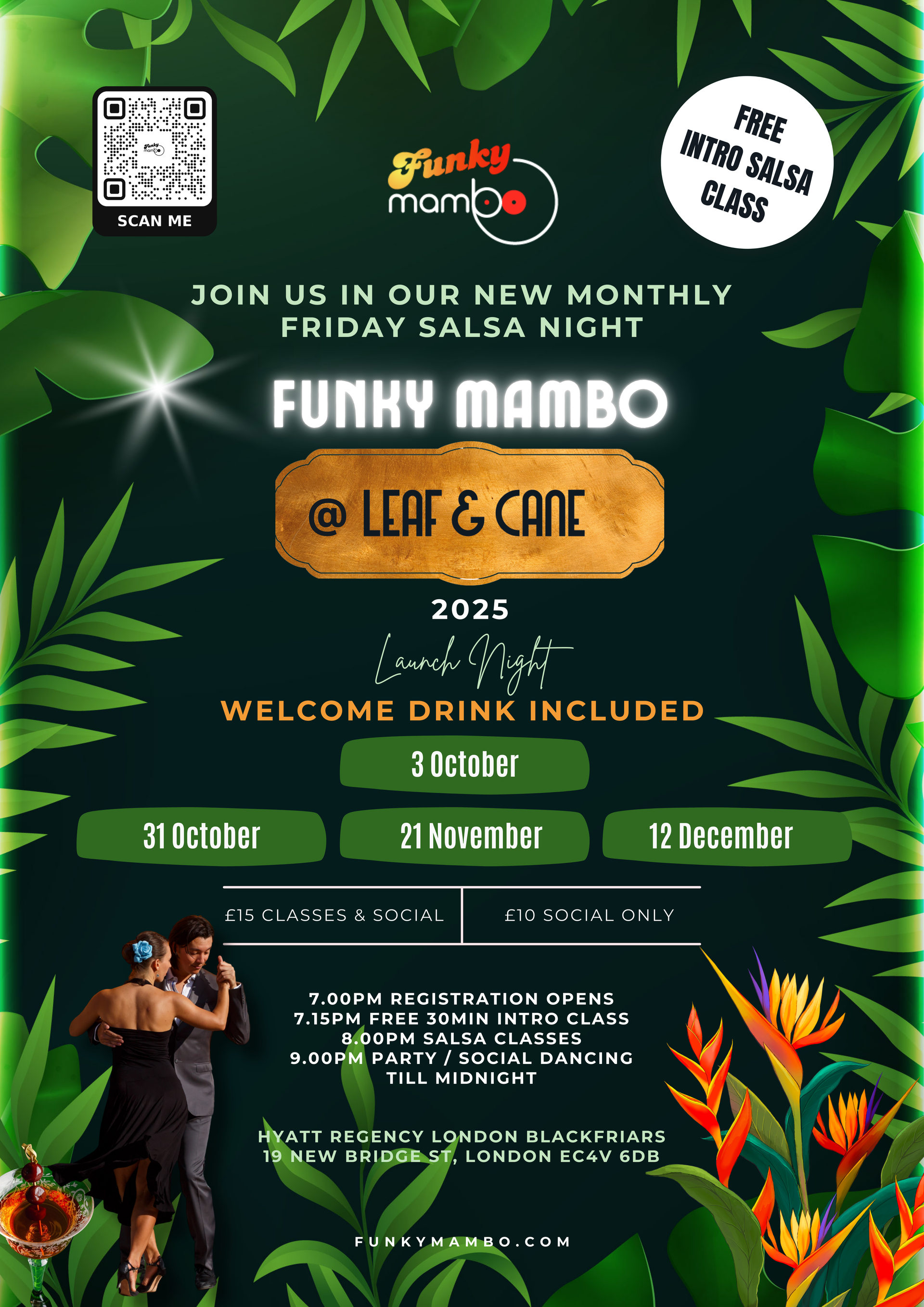 Get ready, London! 🌆 Funky Mambo – the city’s premier Mambo school – is teaming up with the vibrant Latin cocktail bar Leaf & Cane 🍹 to bring you an exciting new monthly Friday Salsa Night right in the heart of the City.